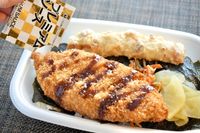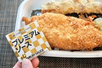 のり弁当の白身魚のフライに付属のプレミアムソースをかける様子