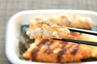 のり弁当の白身魚のフライを黒い箸で持ち上げる様子