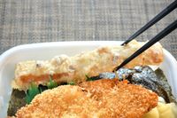 白身魚のフライがのったのり弁当のちくわ磯辺揚げを黒い箸で持ち上げる様子