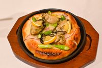 牡蠣とアスパラガスのちいさなブレッドピザのアップ