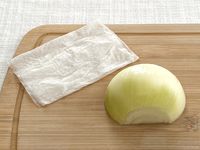 濡らしたキッチンペーパーと薄切りにした玉ねぎ