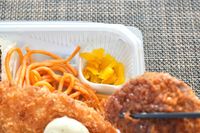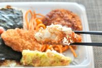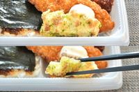 白い容器ののり弁とソースのかかった野菜コロッケを黒い箸で持つ様子