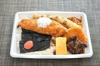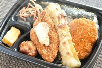 白い容器に盛られた白身魚のフライやちくわの磯辺揚げやコロッケがのったのり弁
