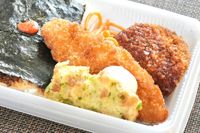 白い容器に盛られた白身魚のフライやちくわの磯辺揚げやコロッケがのったのり弁のおかずアップ