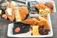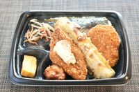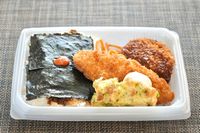 白い容器に盛られた白身魚のフライやちくわの磯辺揚げやコロッケやタレつくねがのったのり弁のおかずのアップ