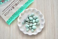 白いテーブルと白い小皿にのったチョコミント味のクランチチョコとパッケージの袋と手