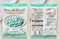 白いテーブルとストライプの布とチョコミントの麦チョコのパッケージと成分表示