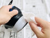 靴についた歯磨き粉をティッシュで拭き取っている様子