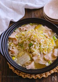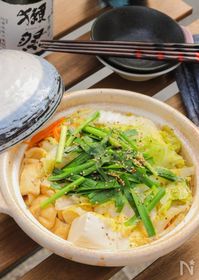 ニラがトッピングされた白菜の塩ちゃんこ鍋