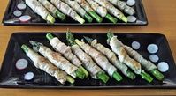黒の皿にアスパラの豚バラ巻きがのっている様子