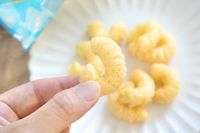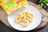 木のカッティングボードと白い皿にのったパイン風味のキャラメルコーンを手に持つ様子