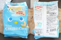 木のカッティングボードと白い皿にのったバニラ風味のキャラメルコーンと水色のパッケージ