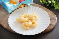 木のカッティングボードと白い皿にのったバイン味のキャラメルコーンと黄色いパッケージの袋