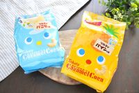 木のカッティングボードにのった黄色と水色パッケージのキャラメルコーンとストライプの布とグリーン