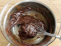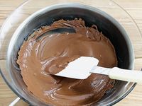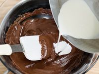 溶かしたチョコレートに温めた生クリームを加えている様子