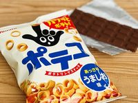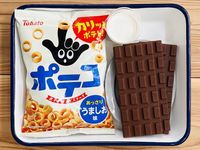 テーブルの上に「ポテコ」と板チョコレートが置かれている様子