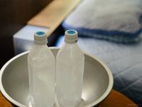 冷凍ペットボトルをベッド脇に置いた様子