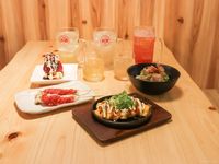 鳥貴族の新フェア「うぬぼれ続けて創業40周年 ありがとうフェア」の限定メニューが木製のテーブルの上に並んでいる