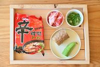 木のトレイにのった辛ラーメンと複数の食材