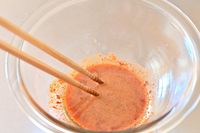 ガラスボウルに入った赤い調味料を箸で混ぜている