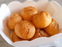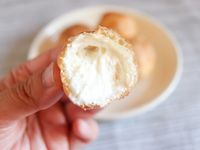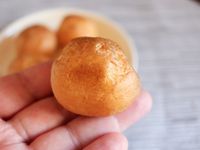 モンテール「9Pチーズクリームプチシュー」をひとつ、手のひらにのせている