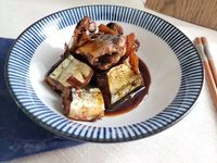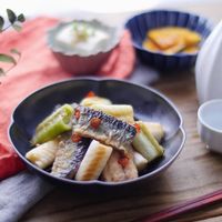 花型の皿に盛り付けたさんまのたっぷりごま味噌煮