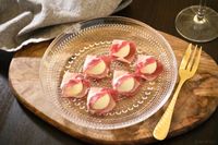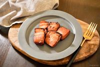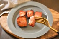 木のカッティングボードとグレーの皿にのったコンビニの直火焼ベーコンのチルド惣菜とグレーの布と金のフォーク