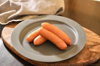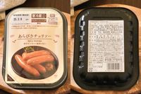 木のカッティングボードにのったコンビニのあらびきチョリソーの惣菜の成分表示とグレーの布