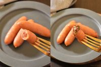 木のカッティングボードとグレーの皿にのったコンビニのチョリソーを金のフォークに刺す様子とグレーの布