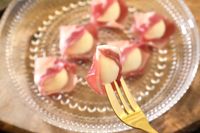 木のカッティングボードとガラスの器にのったコンビニの肉系チルド惣菜を金色のフォークで刺す様子