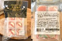 木のカッティングボードにのったコンビニの肉系チルド惣菜の成分表示とグレーの布
