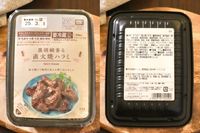 木のカッティングボードにのったコンビニの直火焼ハラミのチルド惣菜の成分表示とグレーの布