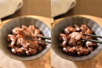 木のカッティングボードと黒い小皿にのったコンビニの直火焼ハラミのチルド惣菜を黒い箸で持ち上げる様子